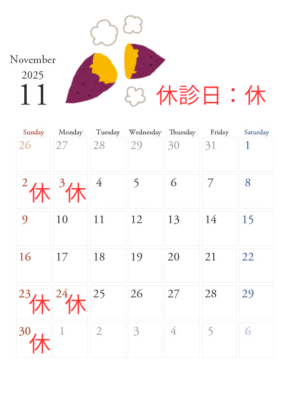 来月は第2日曜日が祝日㊗で休診のため、第1日曜日に診療を行います。
